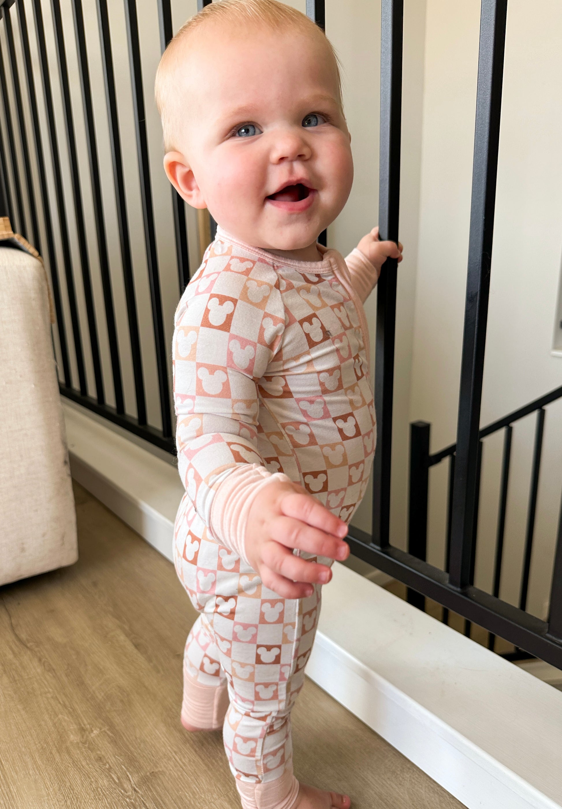 This neutral onesie features a checkered Mick pattern, with pale pink trim to match! The buttery soft, stretchy, material makes for extra comfort and longevity!