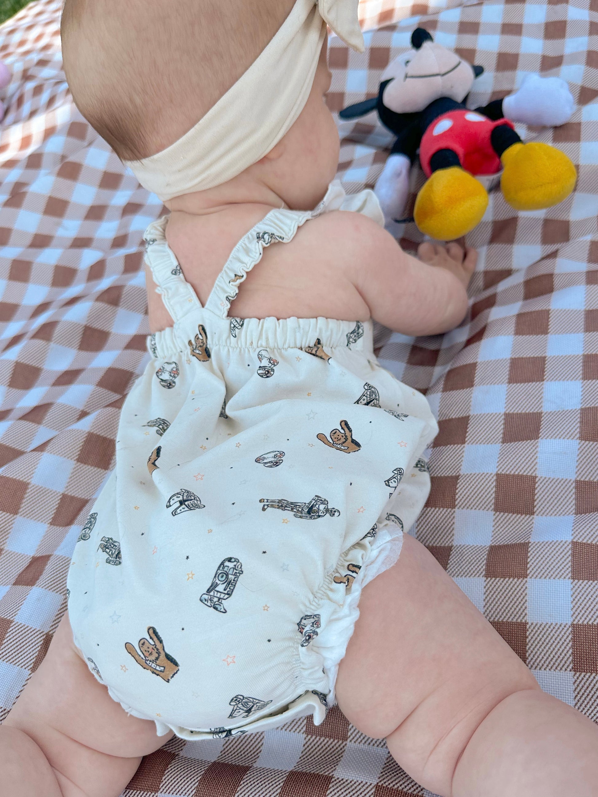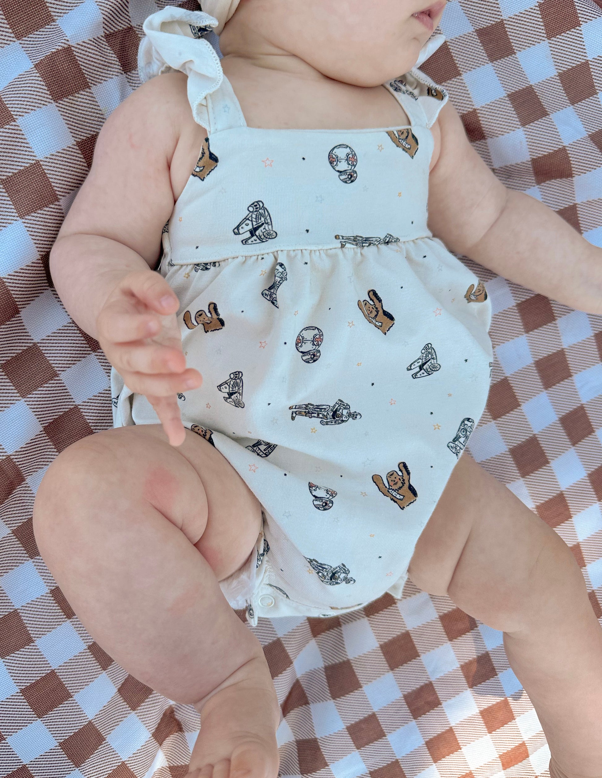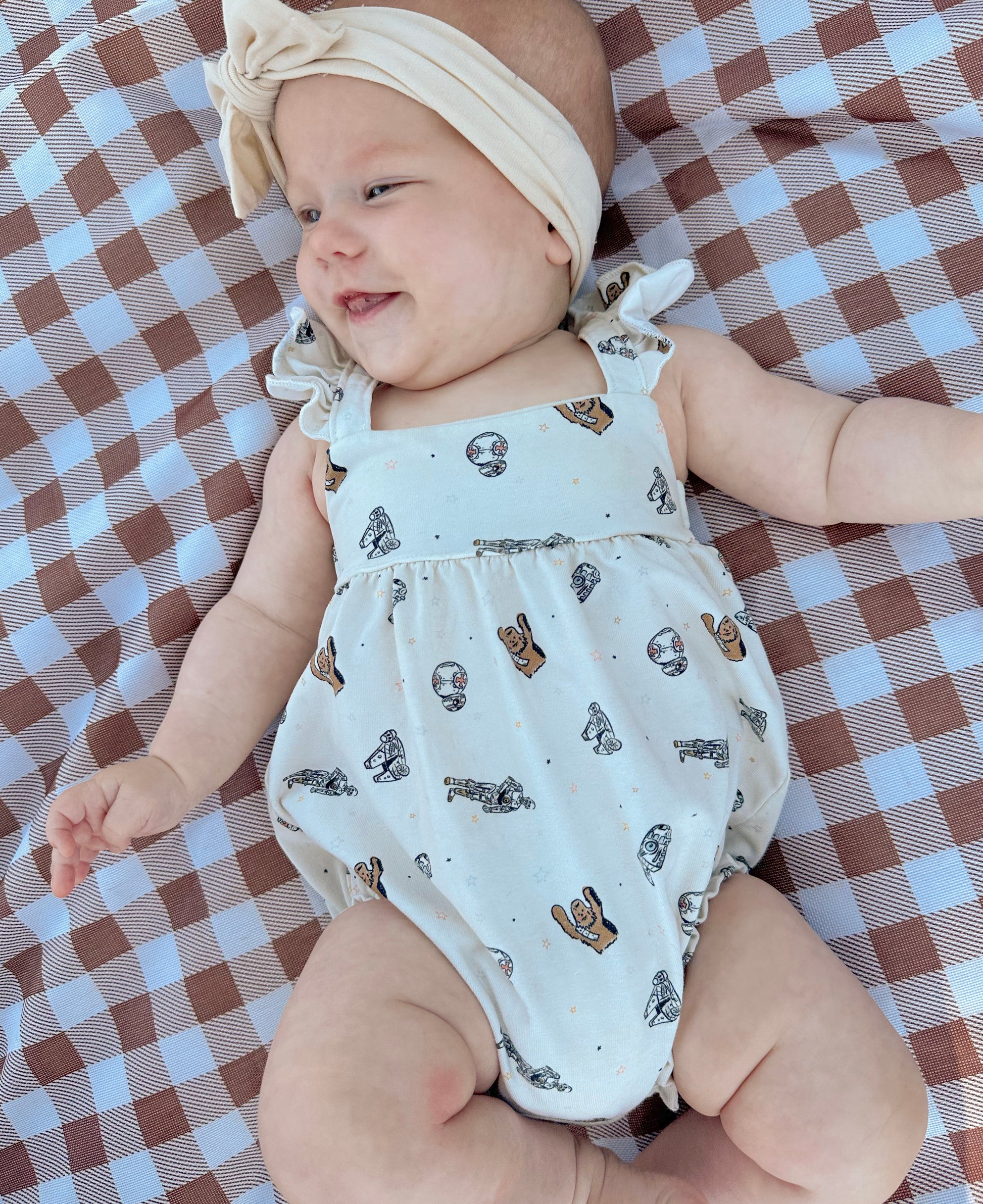 Keep it cute and comfy with this adorable bubble romper featuring a resistance inspired print. Made from soft, breathable cotton with ruffle straps and easy snap closures, it’s perfect for playdates, park days, and everything in between!